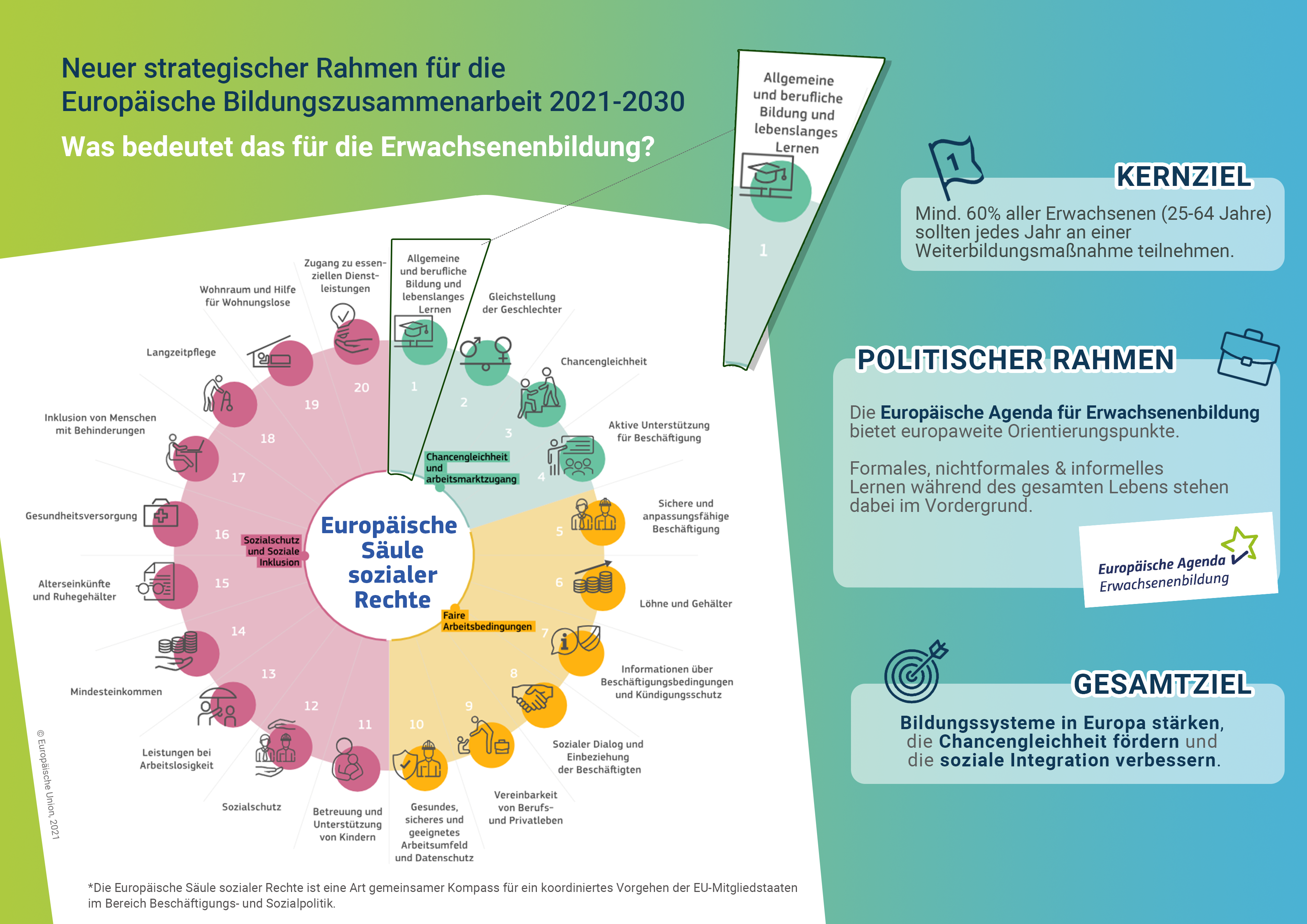 Demnach sollen u.a. formale, nicht-formale und informelle Bildungsangebote geschaffen werden, um Kompetenzen zu vermitteln, die zu einem integrativen und sozial gerechten Europa beitragen. Zudem soll durch Erwachsenenbildung der angestrebte Übergang in eine digitale und grüne Gesellschaft gefördert werden.
