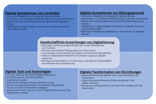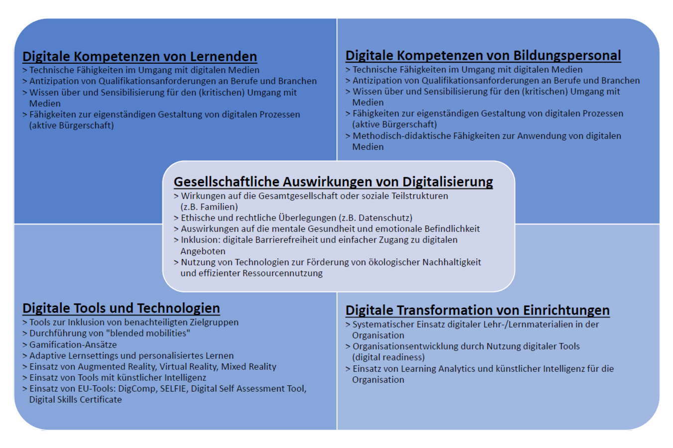 Viele mit Erasmus+ geförderte Projekte und Einrichtungen greifen bereits Aspekte digitalen Lernens auf, wie zum Beispiel den Einsatz digitaler Medien in Lehr-/Lernangeboten. Die Herausforderungen der Digitalisierung sind jedoch vielfältig, und die Entwicklung der notwendigen digitalen Kompetenzen der Menschen hält kaum Schritt mit dem rasanten Tempo der Entwicklung digitaler Technologien und deren Einsatzmöglichkeiten. So ergeben sich ständig neue Anknüpfungspunkte für Projekte in Erasmus+ – sowohl in der Berufsbildung als auch in der Erwachsenenbildung.