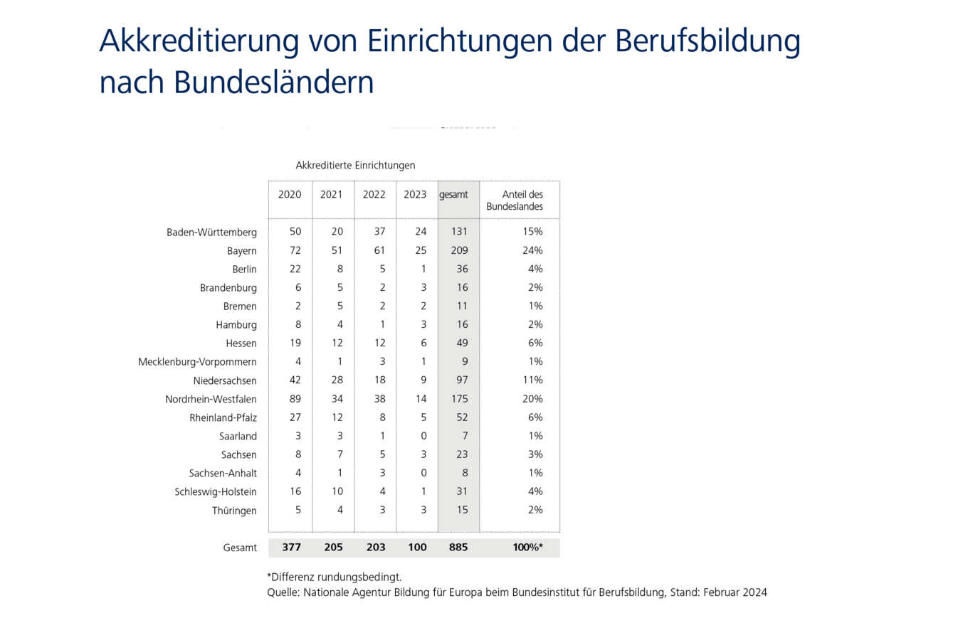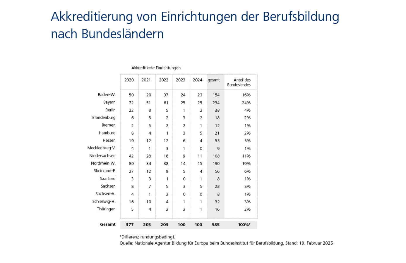 Die Statistik „Akkreditierung von Einrichtungen der Berufsbildung nach Bundesländern 2020 bis 2024“ der NA beim BIBB ist lizenziert unter der Creative Commons Lizenz 4.0 International: Namensnennung – Weitergabe unter gleichen Bedingungen.