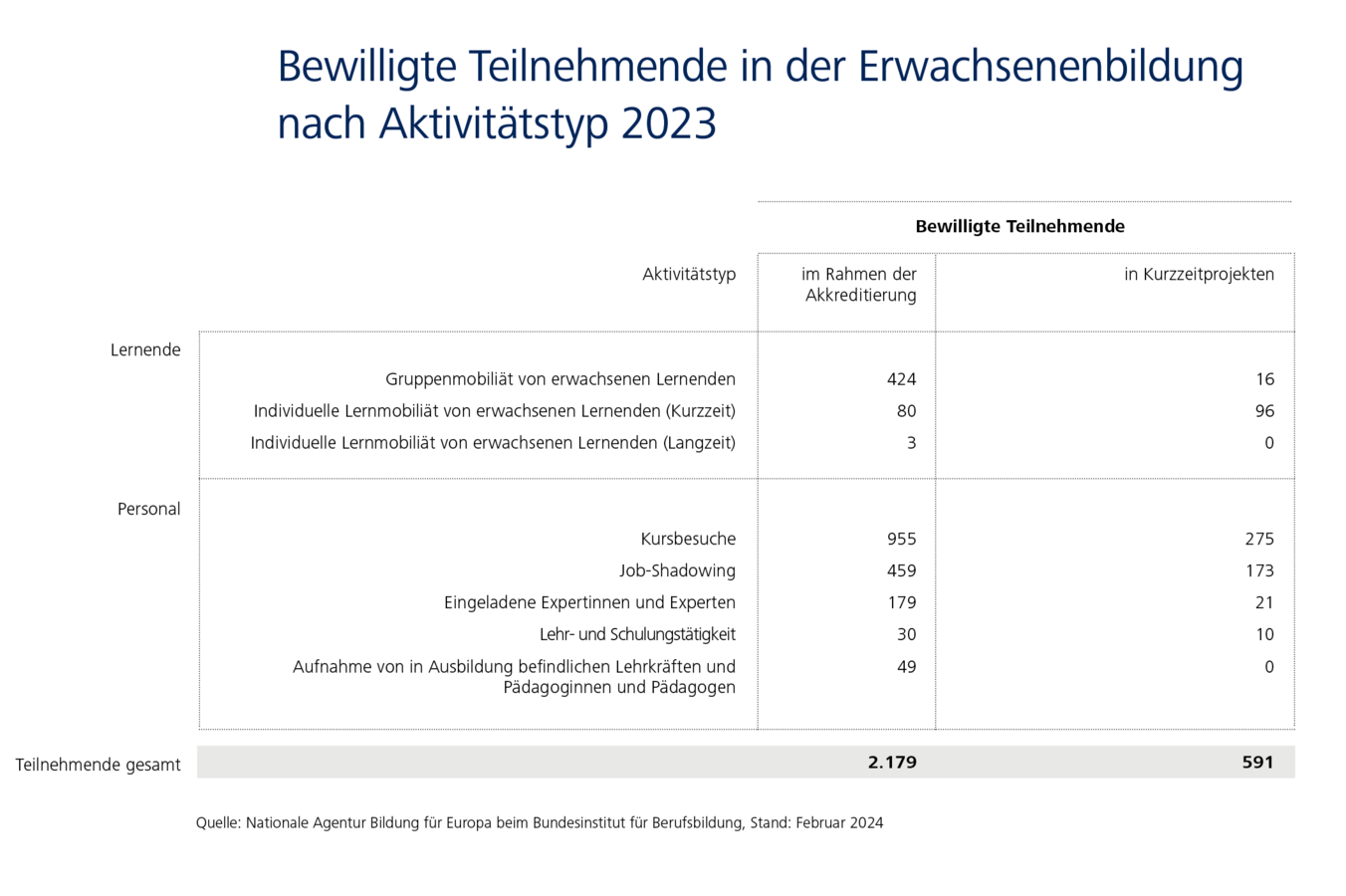 Statistik „Bewilligte Teilnehmende in der Erwachsenenbildung nach Aktivitätstyp 2023“ der NA beim BIBB ist lizenziert unter der Creative Commons Lizenz 4.0 International: Namensnennung – Weitergabe unter gleichen Bedingungen.