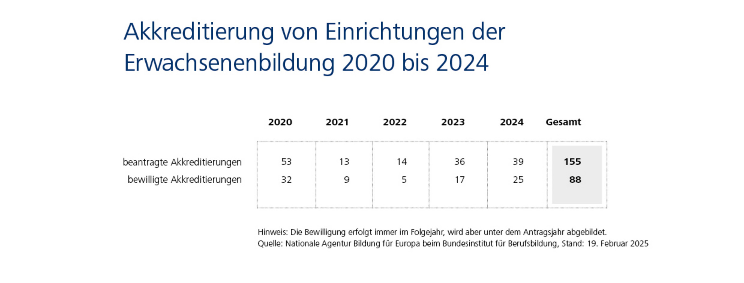 Statistik „Akkreditierung von Einrichtungen der Erwachsenenbildung 2020 bis 2024“ der NA beim BIBB ist lizenziert unter der Creative Commons Lizenz 4.0 International: Namensnennung – Weitergabe unter gleichen Bedingungen.