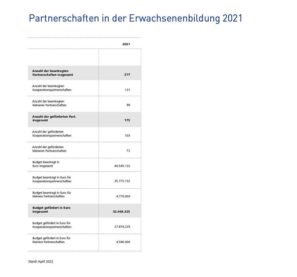 Statistik „Partnerschaften in der Erwachsenenbildung 2021 bis 2022“ der NA beim BIBB ist lizenziert unter der Creative Commons Lizenz 4.0 International: Namensnennung – Weitergabe unter gleichen Bedingungen.