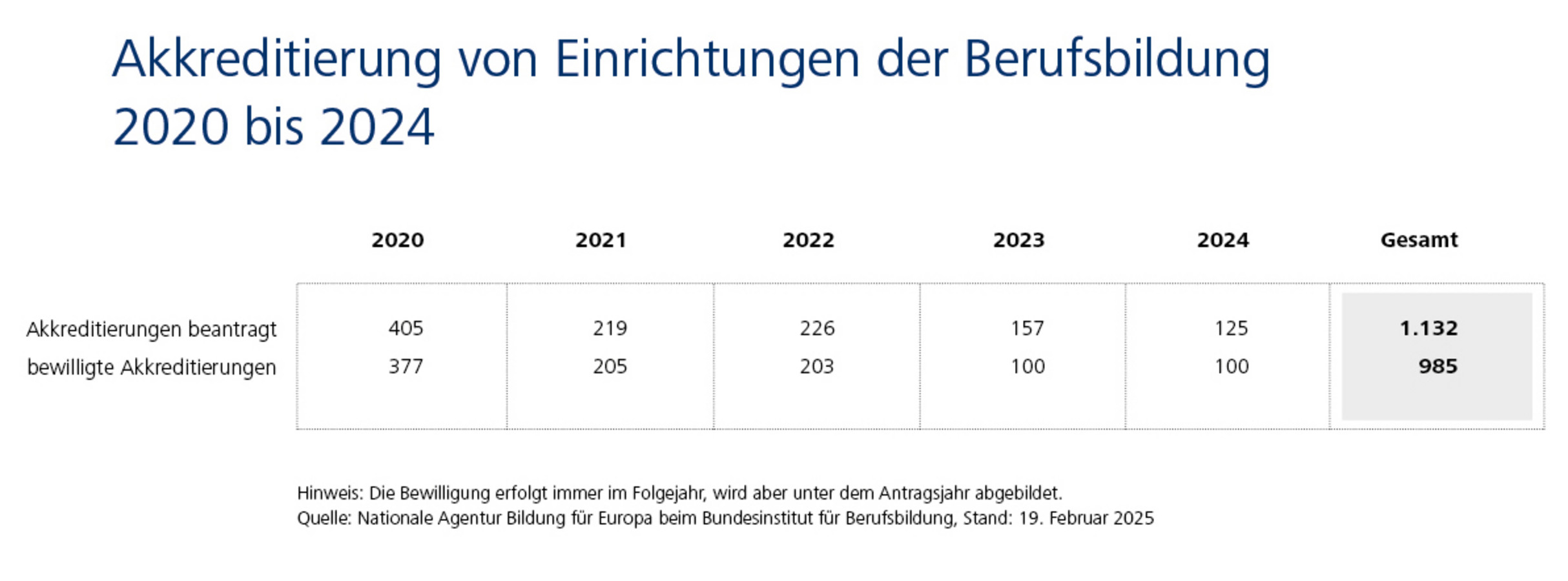Statistik „Akkreditierung von Einrichtungen der Berufsbildung 2020 bis 2024“ der NA beim BIBB ist lizenziert unter der Creative Commons Lizenz 4.0 International: Namensnennung – Weitergabe unter gleichen Bedingungen.