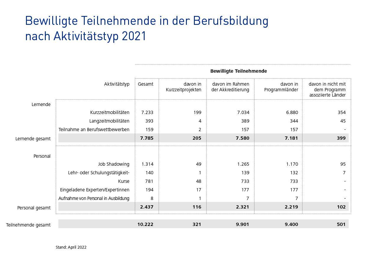 Statistik „Bewilligte Teilnehmende in der Berufsbildung nach Aktivitätstyp 2021“ der NA beim BIBB ist lizenziert unter der Creative Commons Lizenz 4.0 International: Namensnennung – Weitergabe unter gleichen Bedingungen.